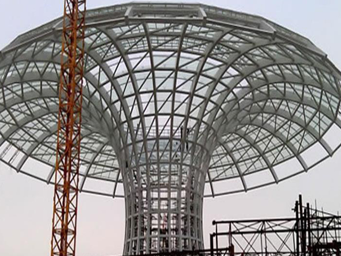 二、球形网架结构因其结构新颖,受力合理,自重轻、用钢量低等优点。如大型体育场馆球形合肥螺栓球网架、公共场馆球形网架、电厂合肥螺栓球网架、水泥工业球形网架、仓储物流球形网架、合肥干煤棚工业球形网架、合肥收费站合肥加油站球形网架、展览中心、影剧院、商场、航站楼、候车厅、工厂合肥车间、仓库、电视塔等球形螺栓球节点网架。国内球形网架结构主要分为:合肥焊接球节点网架及螺栓球节点网架两种。螺栓球节点网架其构件工厂内加工量较大,现场安装便捷,适用于现场工期紧,合肥施工条件、用电量受制约,网架形状复杂、合肥杆件定位困难的异形结构。螺栓球节点球形网架系统基本由合肥杆件、螺栓球、支撑支座等组成。按照节点形式可分为交叉合肥桁架体系、四角锥体系、三角锥体系等。支撑方式多为固定支座支撑。对于大面积、大跨度及有特殊受力或伸缩要求的网架结构可采用橡胶支座、滑移支座、球铰支座等支撑形式,以满足结构自身的受力稳定、均衡,便于内力释放等设计要求。